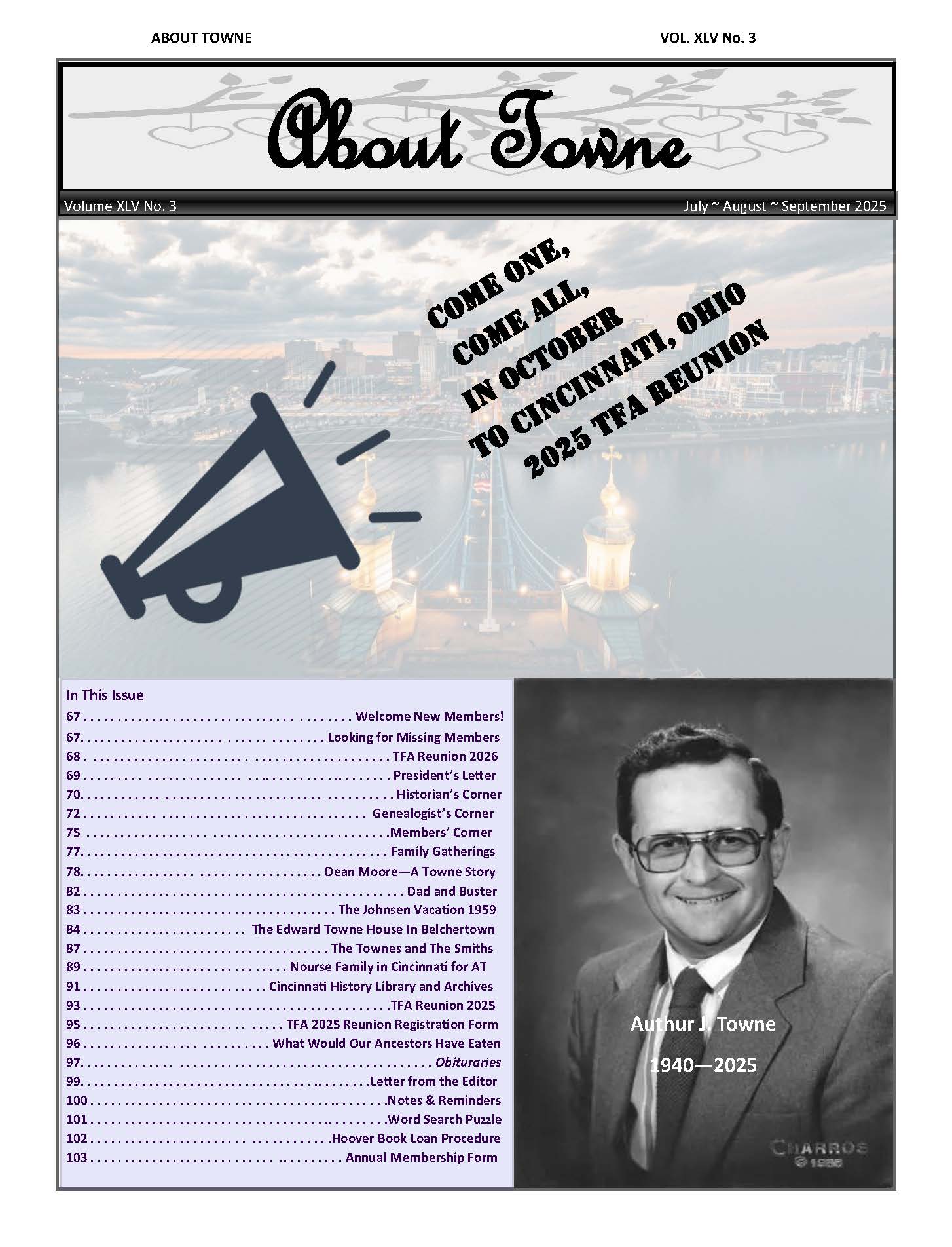 REMINDER: Membership renewals are due July 1, 2025. The membership/renewal form is on the website and in every issue of About Towne.> Renew by July 1st to avoid missing any issues of the newsletter.