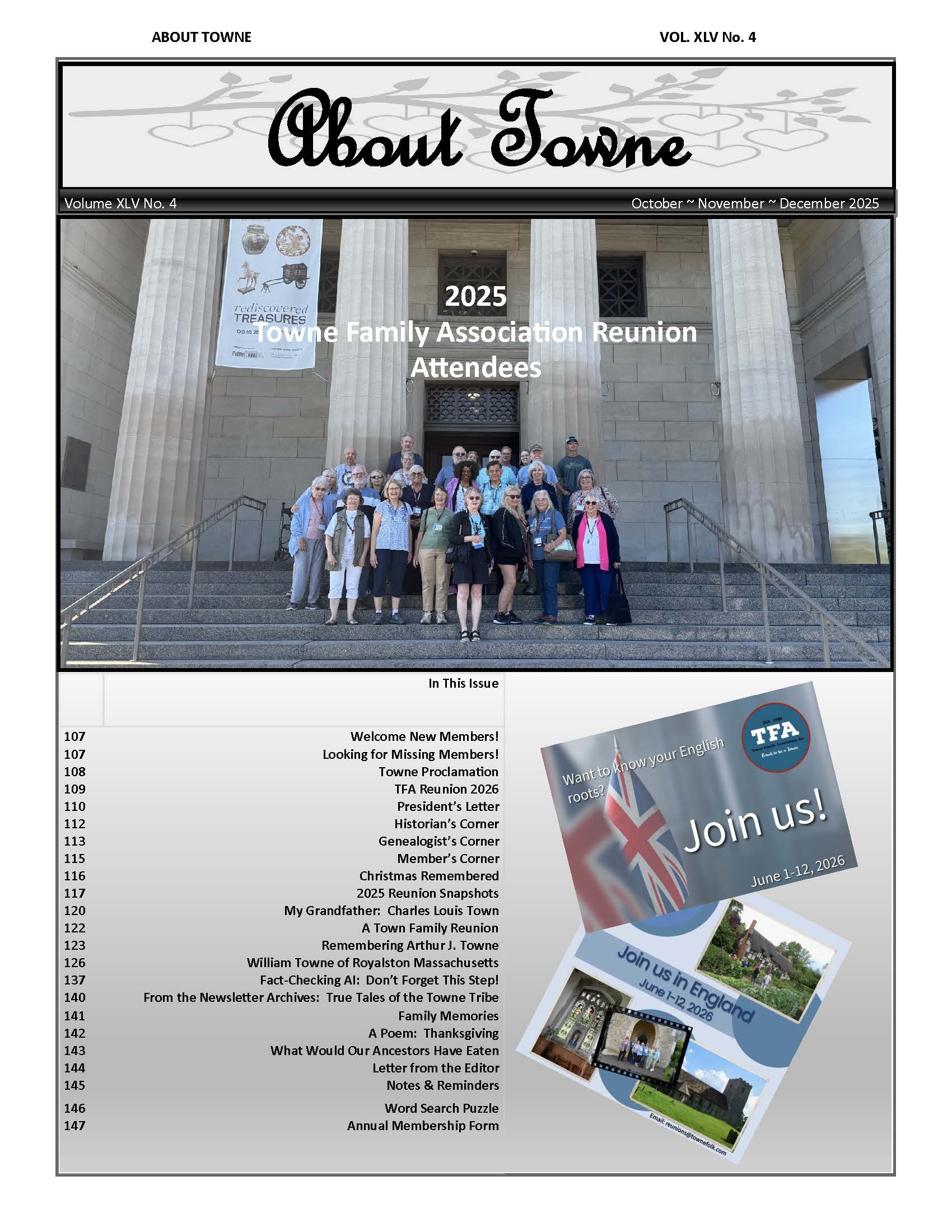 REMINDER: Membership renewals were due July 1, 2025. The membership/renewal form is on the website and in every issue of About Towne.> Renew by July 1st to avoid missing any issues of the newsletter.